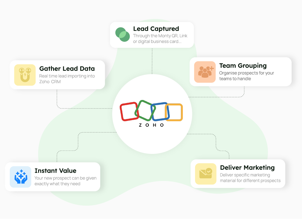 Monty Card integrates seamlessly with Zoho CRM, automatically saving and organizing contacts to streamline your workflow and keep your data up-to-date.