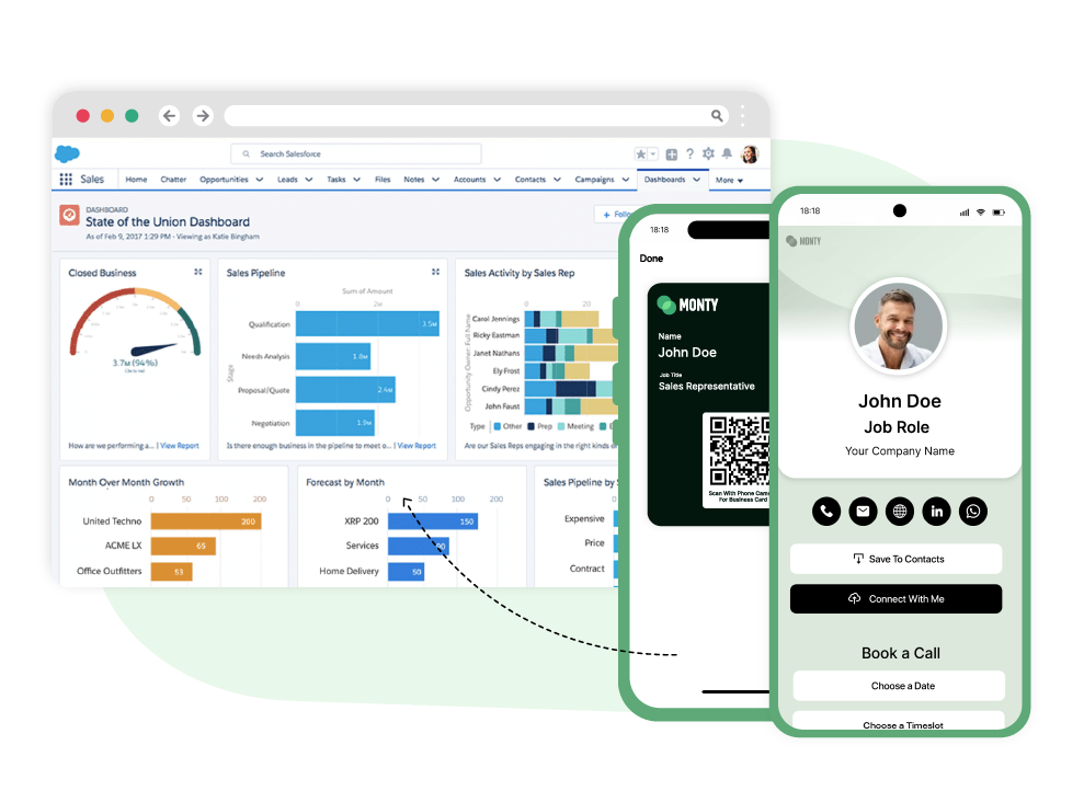 Monty Card connects effortlessly with Salesforce, enabling you to collect contact details on the spot and have them instantly populate your Salesforce CRM for streamlined lead management.